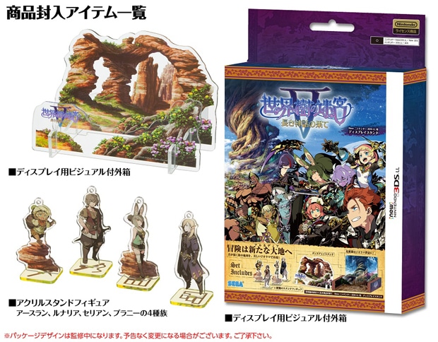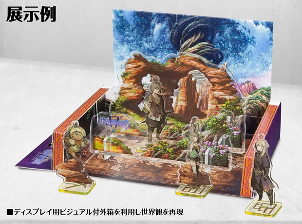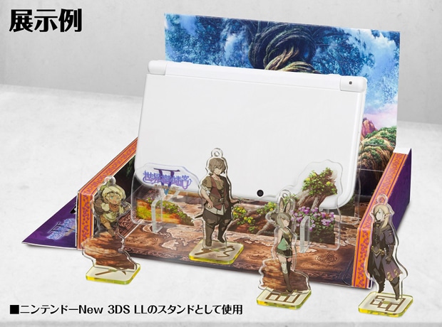 外箱をミシン目に沿って開けば、世界樹がそびえたつ背景が展開されます。そこに、迷宮の第2階層「奇岩の山道」の背景がプリントされた3DS・3DSLL・New3DSLL共用のスタンドを置き、さらにアースラン、ルナリア、セリアン、ブラニーの4種族のアクリルスタンドフィギュアを配置すれば、いく層にも奥行きをもって重なった、『世界樹の迷宮?』ジオラマ世界の完成です。