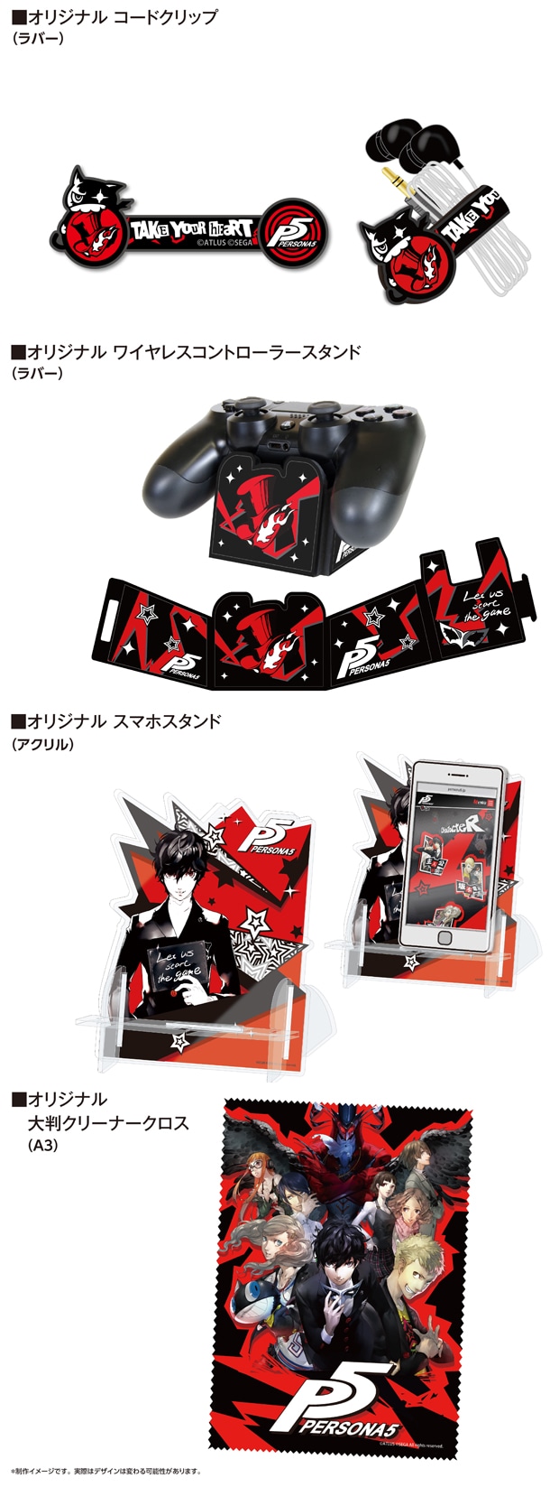 『ペルソナ5』の世界観をイメージしたデザインの公式アクセサリーセットです。セット内容はPS4、PS3用の「オリジナル ワイヤレスコントローラースタンド」、「オリジナル コードクリップ」、「オリジナル大判クリーナークロス」、「オリジナル スマホスタンド」の豪華4点セットです。