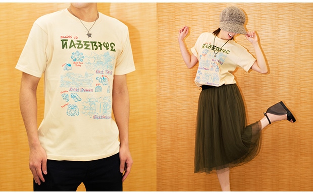 アークス文字で書かれたナベリウスの文字は、フロッキープリントという、フェルトのような不思議なさわり心地のプリントで、着たときの存在感も抜群です。