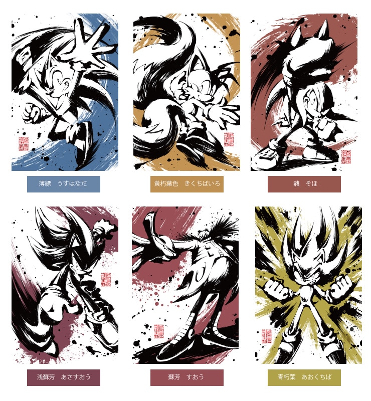 ソニックは薄縹(うすはなだ)、テイルスは黄朽葉色(きくちばいろ)、エッグマンは蘇芳(すおう)、ナックルズは赭(そほ)、シャドウは浅蘇芳(あさすおう)、スーパーソニックは青朽葉(あおくちば)で背景が表現されています。