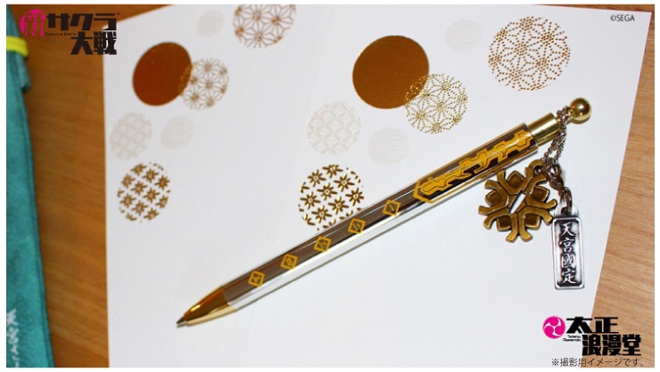 愛刀「天宮國定」をモチーフにしたボールペンと、メタル製の鍔チャーム、刀袋風筆入れ、お守りに手紙を添えた豪華セットになります。