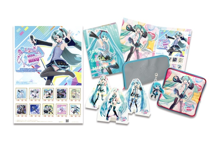 10周年記念イラストを使用したフレーム切手&切手台紙と、ゲーム機を持ち運べるキャラクターポーチ、ミクダヨーアクリルチャーム、POP型のポストカード3種が入ったメモリアルな商品です。