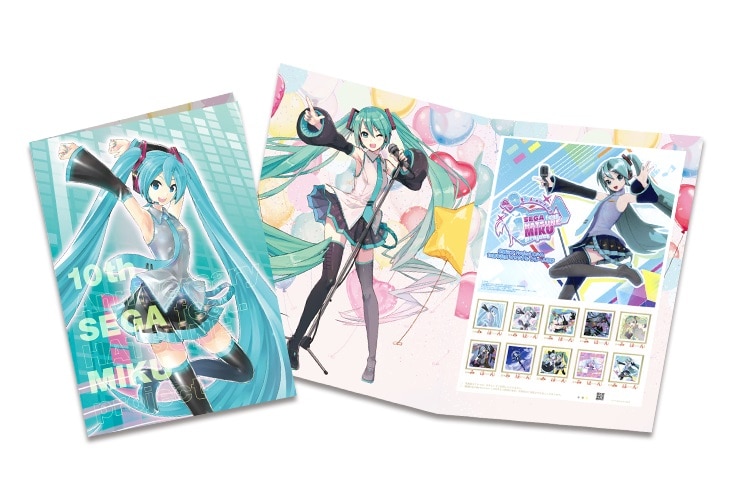 KEIさん・iXimaさんの10周年記念イラストを使用した台紙に、『初音ミク Project DIVA MEGA39's』のキービジュアルとDIVA10周年記念イラスト9種を使用したフレーム切手を封入しました。フレーム切手の種別は63円×10枚となります。