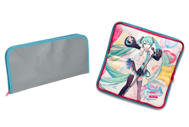 初音ミクをイメージしたカラーリングのゲーム機も収納できるキャラクターポーチです。外側はシルバーのエナメル生地にDIVA10周年ロゴを型押ししたシンプルな見栄えですが内側にはiXimaさんの10周年記念イラストが大きくプリントされています!