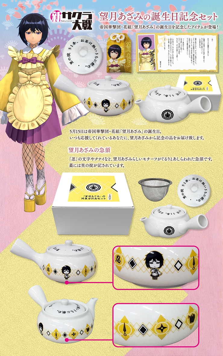 望月あざみの誕生日を記念したオリジナルの急須、お守り、手紙のセットです。