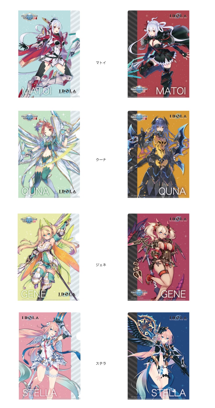 『イドラ ファンタシースターサーガ』に登場する、シリーズの人気ヒロインたちが集結し、クリアファイルセットになりました! 『PSO2』よりマトイとクーナ、『PSO2es』よりジェネ、そして『イドラ ファンタシースターサーガ』のステラが、それぞれロウ・カオスに分岐した美麗な姿をご堪能あれ!
