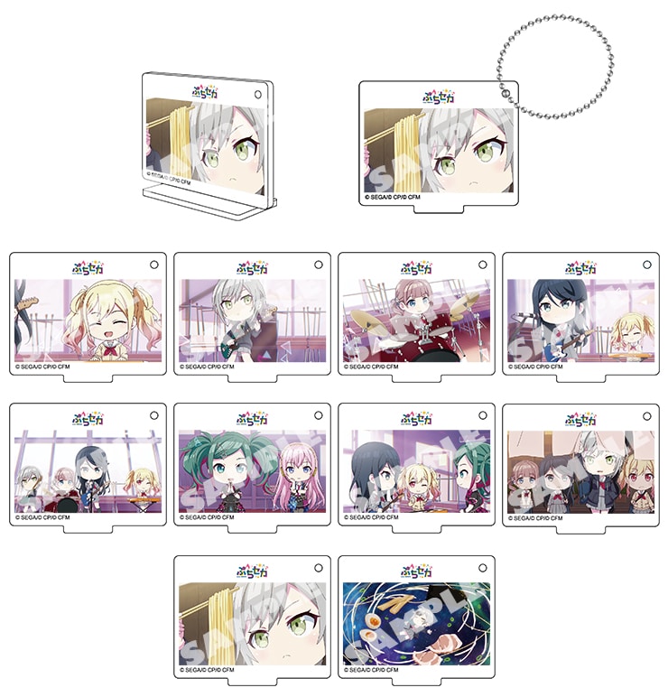 『プロジェクトセカイ カラフルステージ! feat. 初音ミク』のミニアニメ「ぷちセカ」の様々なシーンを切り取ったアクリルフォトスタンドです。付属のボールチェーンを使えばチャームとしてカバンなどにつけることも出来ます。