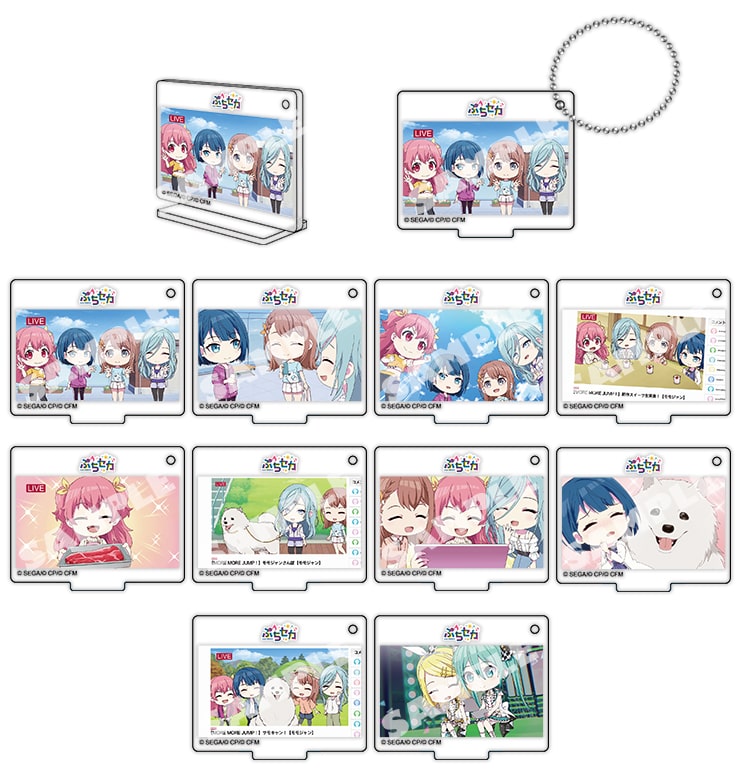 『プロジェクトセカイ カラフルステージ! feat. 初音ミク』のミニアニメ「ぷちセカ」の様々なシーンを切り取ったアクリルフォトスタンドです。付属のボールチェーンを使えばチャームとしてカバンなどにつけることも出来ます。