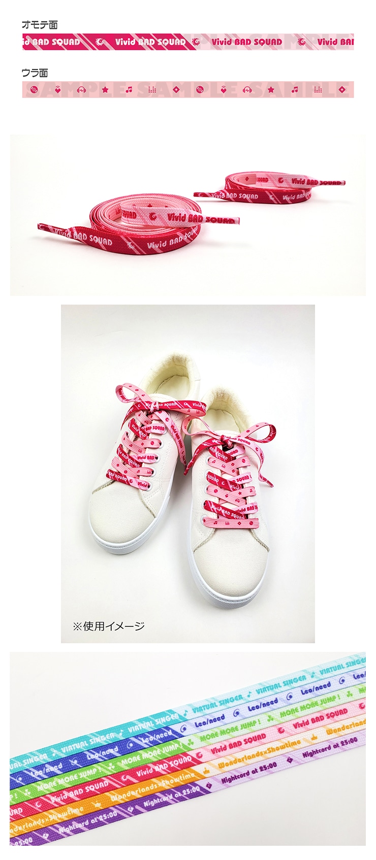 さりげなく「Vivid BAD SQUAD」推しをアピールできるシューレースです。紐のセンターで配色が分かれており、さらに裏面も別デザインになっているので、結び方次第で様々にアレンジできます!