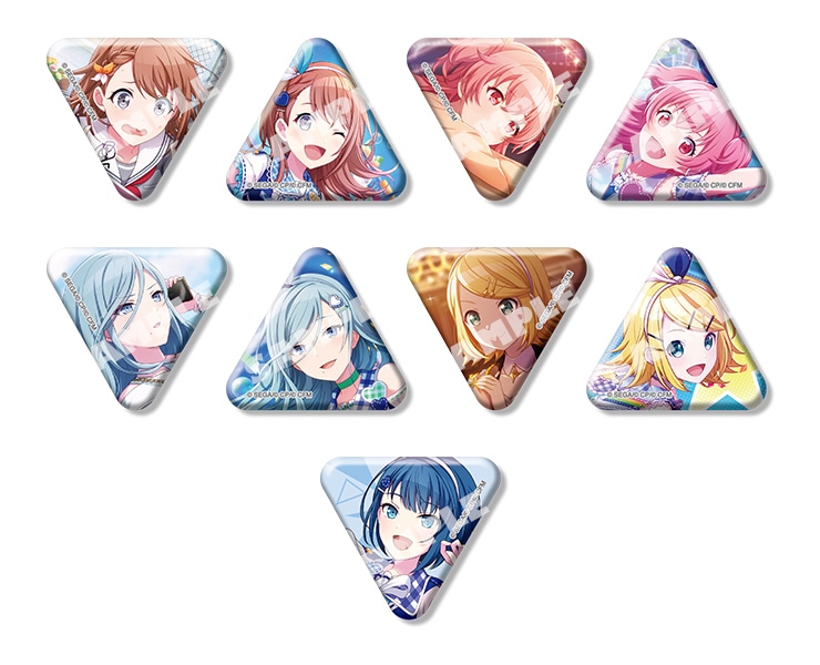 『プロジェクトセカイ カラフルステージ! feat. 初音ミク』に登場するキャラクターのイラストがコレクションできるミニサイズの三角缶バッジです。vol.2 Bではゲーム内イベント「ここからRE:START!」から花里 みのり、桐谷 遥、桃井 愛莉、日野森 雫、鏡音リンの全9種がラインナップ。