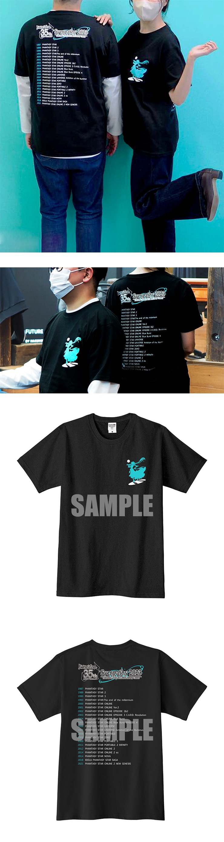 「シンパシー2023」の開催を記念して描かれた、月の光に照らされてバイオリンを弾くマトイのキービジュアルをシルエット化し、背面には35周年を迎える『ファンタシースター』シリーズの軌跡をプリントしたTシャツです。