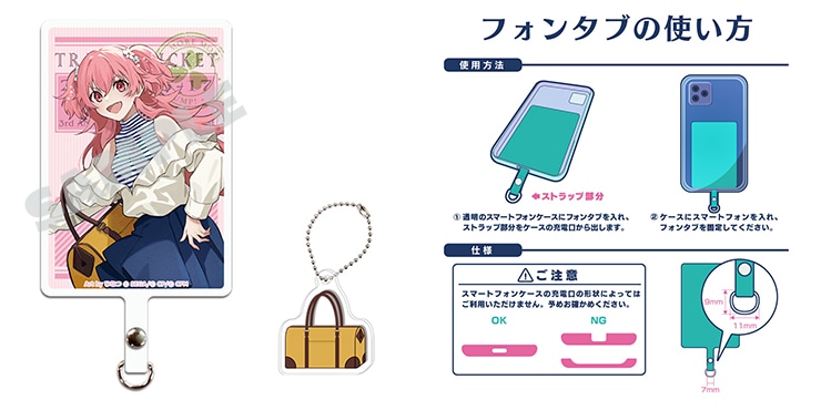 イベント『プロジェクトセカイ 3rd Anniversary 感謝祭』のフォンタブです。ひなつさん描き下ろしのキャラクターがチケット風にデザインされた本体と、キャラクターが持っているカバンのアクリルチャームのセットです。スマホとスマホケースの間にセットして推しをアピールしちゃいましょう♪ 別売りのネックストラップと一緒に使うのもオススメです。