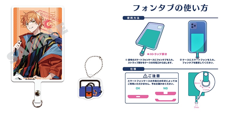 イベント『プロジェクトセカイ 3rd Anniversary 感謝祭』のフォンタブです。ひなつさん描き下ろしのキャラクターがチケット風にデザインされた本体と、キャラクターが持っているカバンのアクリルチャームのセットです。スマホとスマホケースの間にセットして推しをアピールしちゃいましょう♪ 別売りのネックストラップと一緒に使うのもオススメです。