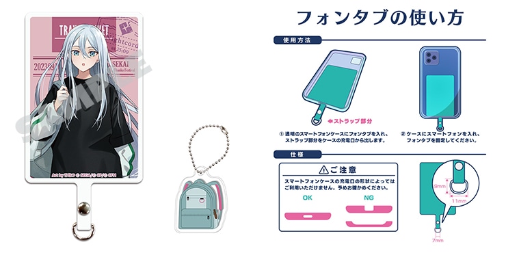 イベント『プロジェクトセカイ 3rd Anniversary 感謝祭』のフォンタブです。ひなつさん描き下ろしのキャラクターがチケット風にデザインされた本体と、キャラクターが持っているカバンのアクリルチャームのセットです。スマホとスマホケースの間にセットして推しをアピールしちゃいましょう♪ 別売りのネックストラップと一緒に使うのもオススメです。