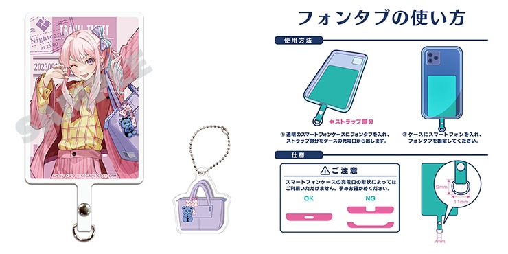 イベント『プロジェクトセカイ 3rd Anniversary 感謝祭』のフォンタブです。ひなつさん描き下ろしのキャラクターがチケット風にデザインされた本体と、キャラクターが持っているカバンのアクリルチャームのセットです。スマホとスマホケースの間にセットして推しをアピールしちゃいましょう♪ 別売りのネックストラップと一緒に使うのもオススメです。