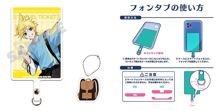 イベント『プロジェクトセカイ 3rd Anniversary 感謝祭』のフォンタブです。ひなつさん描き下ろしのキャラクターがチケット風にデザインされた本体と、キャラクターが持っているカバンのアクリルチャームのセットです。スマホとスマホケースの間にセットして推しをアピールしちゃいましょう♪ 別売りのネックストラップと一緒に使うのもオススメです。