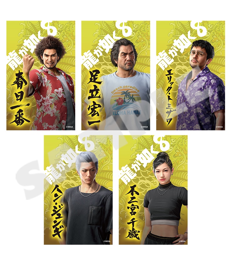 『龍が如く8』のキャラクターステッカー5枚セットが登場。こちらは春日一番、足立宏一、エリック・トミザワ、ハン・ジュンギ、不二宮千歳のセットです。※春日以降は五十音順で名前記載しております。