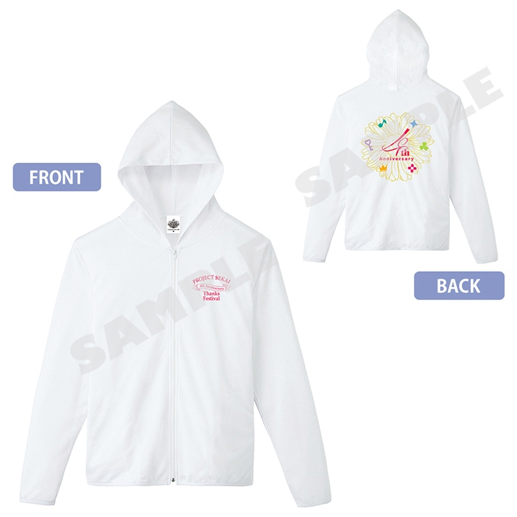 イベント『プロジェクトセカイ 4th Anniversary 感謝祭』開催記念パーカーです。背面はキャラクターたちが手に持っているガーベラの花を大胆にプリント。ユニットモチーフを散りばめたオシャレなデザインです。速乾性のある、さらさらとした薄手の生地を採用しているので夏にもピッタリの一枚です♪