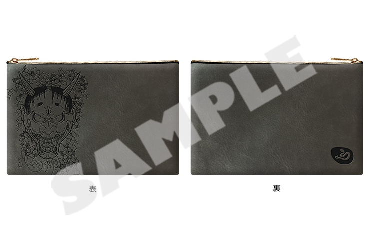 表面に般若、背面には眼帯がエンボスでクールにデザインされ、グレーの合皮で落ち着きと高級感のあるポーチです。中は真島のキャラクターカラーである紫カラーの布地で大人の雰囲気があります。外出先でもさり気なく持ち歩いて楽しめるポーチです。