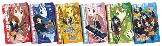 「けいおん!」キャラクター5人それぞれと5人全員集合のイラストをあしらった計6枚のICカードステッカーを1セットにした「ICカードステッカーセット」。