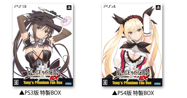限定版『ブレードアークス from シャイニングEX -Tony's Premium Fan Box-』が同時発売。「ブレードアークスEX」の枠を越えた、すべての「シャイニング」シリーズファンに贈る究極の限定版です。限定版には、Tony氏責任編集によるオフィシャルブックをはじめ、商品化が待ち望まれていた『シャイニング・アーク』のキャラクターソングCDや『シャイニング・ブレイド』のサウンドトラックCD、さらに水着姿のヒロインたちがデザインされた2016年カレンダーがセットになっています。