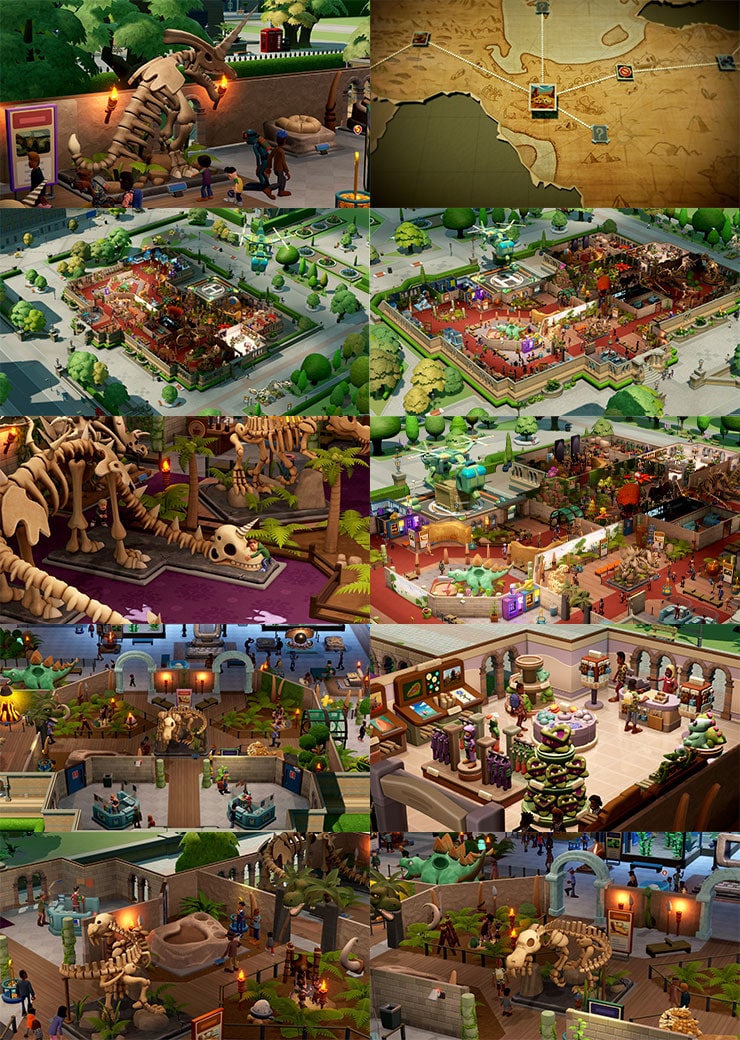 展示室の壁を塗り替え、カーペットを敷き、太古の植物、氷漬けのミイラ、恐竜の化石などの展示品を好きに配置しよう。