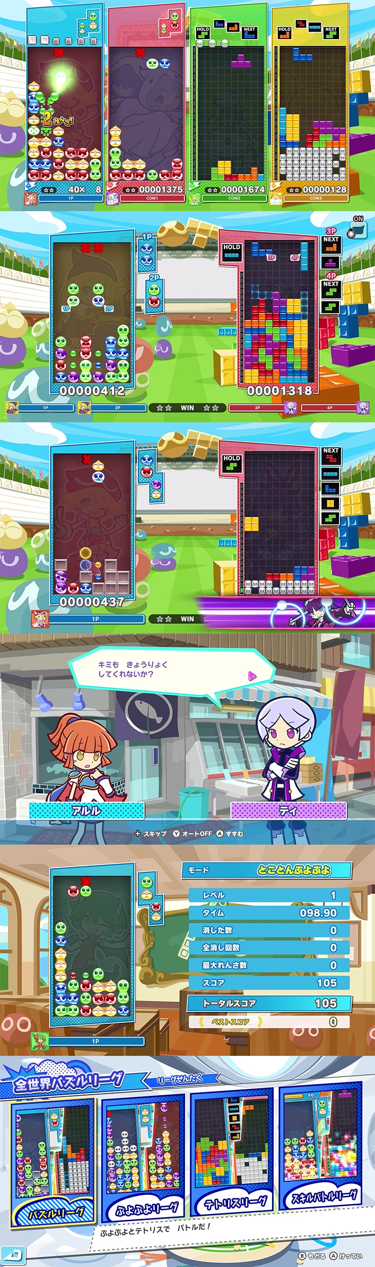 さらに今作では、新モード「いっしょにぷよテト」を収録!1つのフィールドに落ちてくる2つの組ぷよ・テトリミノを2人でそれぞれ操作する、協力モードだよ。