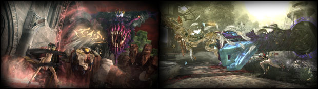 ●魔女ならではの多彩でダイナミックな攻撃 ベヨネッタは美しく長い”髪”をもっており、その”髪”を触媒にして行う“魔人召喚”は超強力! 通常攻撃コンボのフィニッシュに、巨大な魔人の“腕”や“足”を召喚して攻撃することができる。 また、ステージのボスなど、強力な敵にトドメを刺すときには、 巨大で凶暴な“大魔獣”を召喚する 迫力満点の映像は必見!