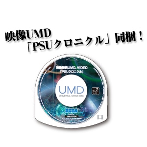 | ファンタシースターユニバースから続く、グラール太陽系の壮大なストーリーを収録した映像UMD 「PSUクロニクル」(約63分)をすべてのパッケージに同梱。映像UMD+ゲームUMDの豪華2枚組。 | ![]() |