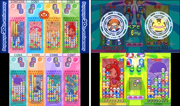 1カードリッジ最大8人対戦できる「みんなでぷよぷよ」や「フリーたいせん」では、3DSの「カメラ」を使って撮影した「ぷよのしゅるい」「フィールド」を使うカスタマイズ機能を収録。さらに、初心者から上級者まで2対2のペアで協力して対戦する「ペアでぷよぷよ」も収録。もちろん、1人でもCOMと一緒にプレイできる。さらにさらに、インターネット対戦では、全国のライバルと気軽に無料でインターネット対戦が楽しめる。