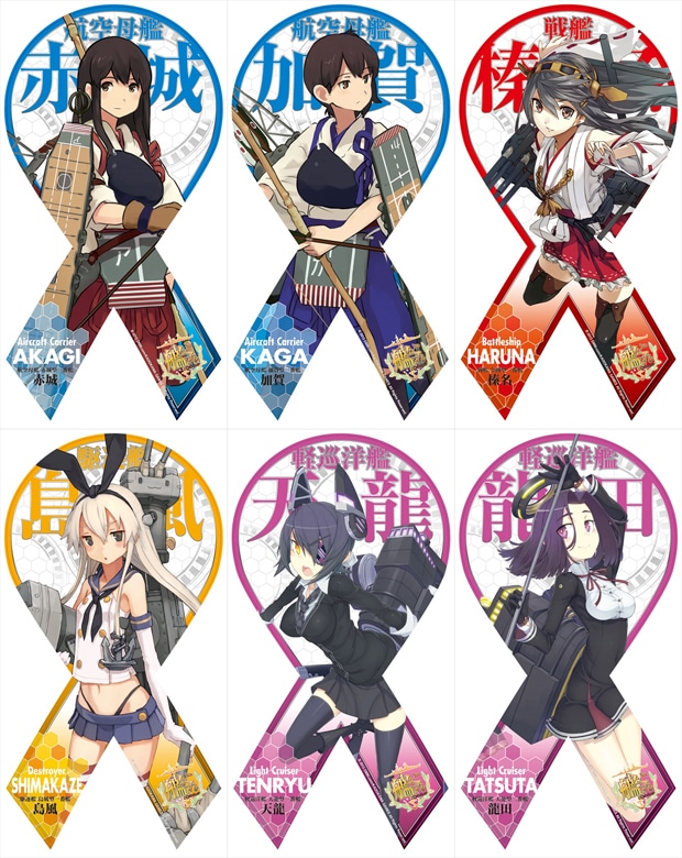 リボン型に艦娘&艦船名が存在感たっぷりにデザインされた、提督必携のアイテム。愛車や冷蔵庫、デスク等に貼って、艦娘の帰還を祈りましょう!