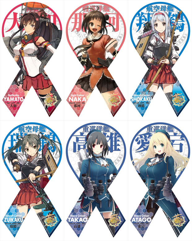 リボン型に艦娘&艦船名が存在感たっぷりにデザインされた、提督必携のアイテム。愛車や冷蔵庫、デスク等に貼って、艦娘の帰還を祈りましょう!