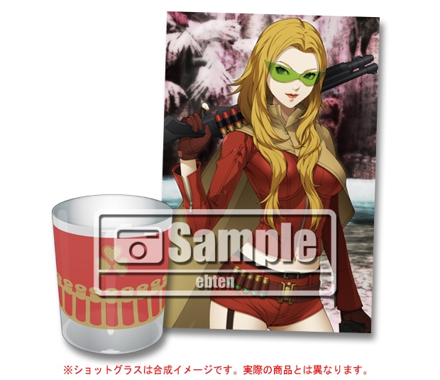 ショットガン&ハンドガンで武装した紅の女性キャラクターをフィーチャーにしたショットグラスとブロマイド。