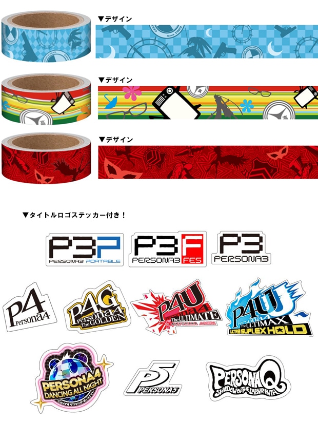 『ペルソナ3』『ペルソナ4』『ペルソナ5』、それぞれのタイトルを象徴する意匠やモチーフをポップに配したマスキングテープ3種セットに歴代タイトルロゴステッカー10種を加えたオトクなセットです。