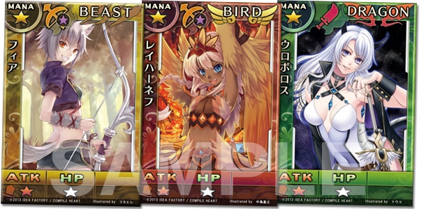 ゲームに登場する重要モンスター娘が本物のカードに!!主人公のパートナー「フィア」、オキ・ナーヴォの代表「ネフ」、原初のモンスター娘「ウロボロス」の3枚を同梱します。