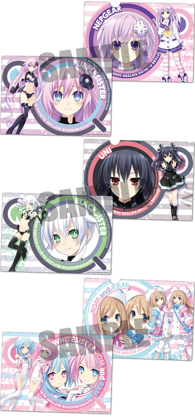 ゲイムギョウ界で女神を目指すネプギア、ユニ、ロム/ラム、4人の候補生のイラストが配されたオリジナルデザインのクリアファイル3種セットです。