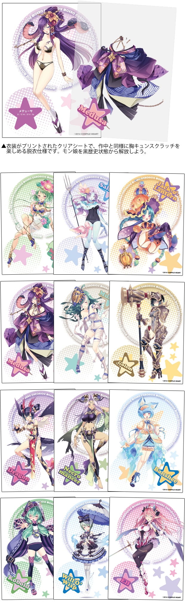 本作に登場するモンスター娘12体の着せ替えスタンドポップです。キャラクターがプリントされたイラストシートと、衣装がプリントされたクリアシートを重ねたり外したりすることで、ゲーム中の脱衣ギミックが再現できます。