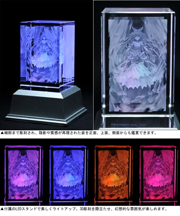 2013年に発売されたPS3用ゲームソフト『デート・ア・ライブ 凜祢ユートピア』の通常版パッケージ用に描かれた“十香”をクリスタルキューブ内に3D立体レーザー彫刻で再現。付属のLEDスタンドに設置することにより、光の加減や角度によってさまざまな見え方をしますので、煌びやかで飽きのこないインテリアアイテムとして楽しめます。