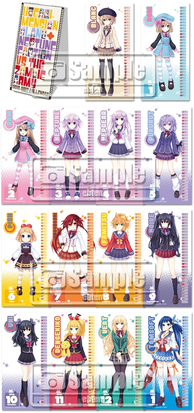 『激次元タッグ ブラン+ネプテューヌVSゾンビ軍団』のキャラクタービジュアルをデザインした卓上カレンダーです。制服姿の四女神や女神候補生たちを毎月飾れる大判(縦300×横150mm)仕様。