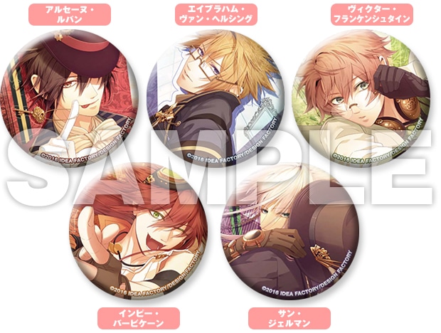 アルセーヌ・ルパン、エイブラハム・ヴァン・ヘルシング、ヴィクター・フランケンシュタイン、インピー・バービケーン、サン・ジェルマンの5人を缶バッジにした5個セット!