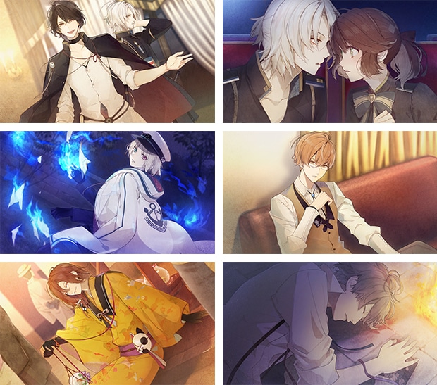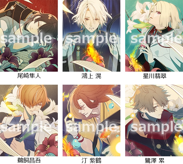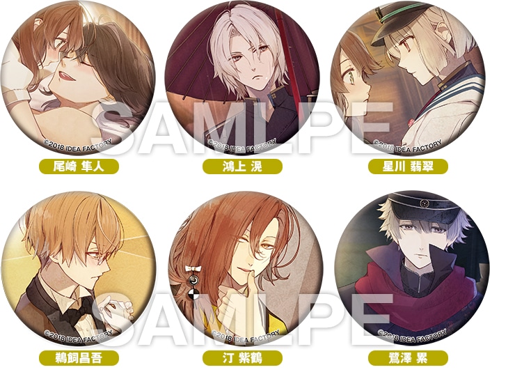 「尾崎隼人」「鴻上 滉」「星川翡翠」「鵜飼昌吾」「汀 紫鶴」「鷺澤 累」のイラストを使用した缶バッジ6種セット。