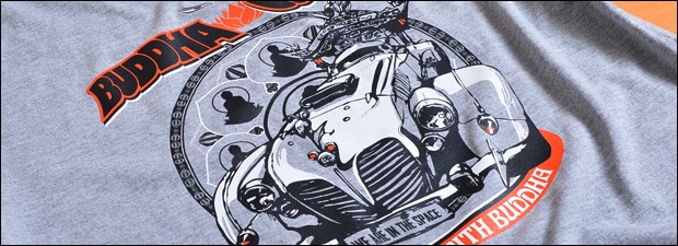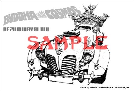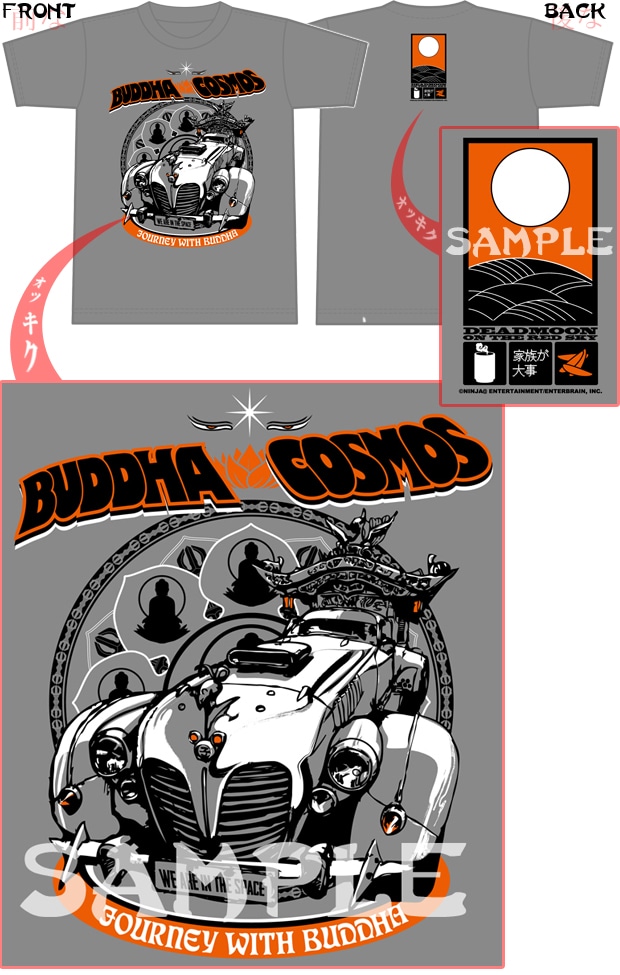『ニンジャスレイヤー』作中に登場する運び屋『デッドムーン』の駆る武装霊柩車『ネズミハヤイDIII』と、彼のフェイバリットミュージックであるダークエレクトロ・ポップ『ブッダコスモス』をコラボレーションしたオリジナルTシャツ。