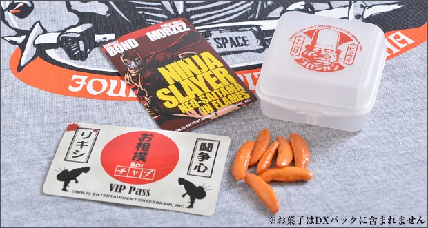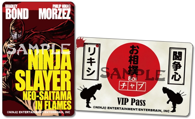 『ニンジャスレイヤー』キービジュアルと、作中に登場する相撲バー『チャブ』のVIPルームパスをイメージしたカード型ステッカー2枚セット。VIPパスには謎の血痕…。あの惨劇の被害者の所持品か!?