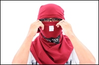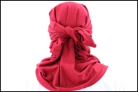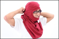 | 10:タグを巻き込み2回ほど巻き上げてタグを隠しつつ口も隠します。 | 11:頬にかかる部分を上げ、目だけ出るようにして完成!! | 12:Wasshoi! | ||