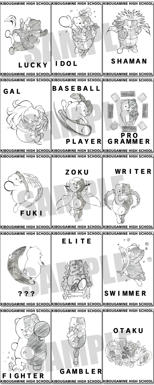 アミサキリョウコ氏により収録時の台本表紙に描かれたイラストをポストカード化。超高校級のメンバーに扮するモノクマが描かれた豪華15枚セットです。