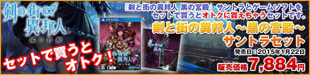 同日発売の『剣の街の異邦人 オリジナルサウンドトラック』と『剣の街の異邦人 ~黒の宮殿~』を同時購入でサントラが796円引きのオトクに買えちゃうセットです。