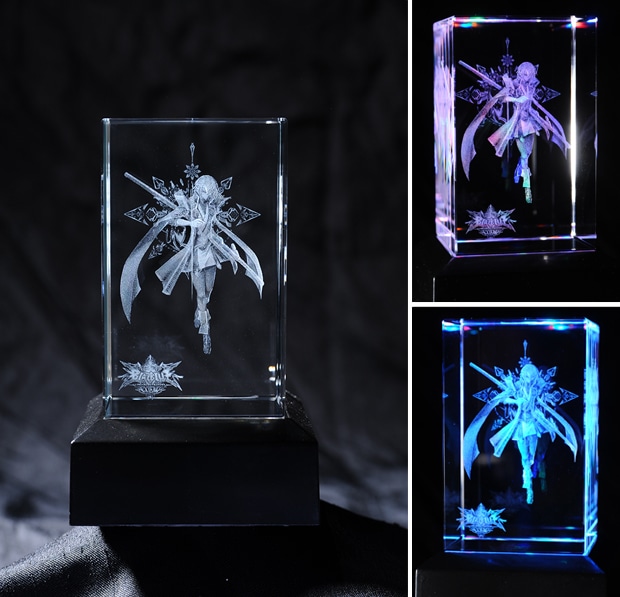 人気キャラクタージン=キサラギのイラストと紋章がクリスタルキューブ内に3D立体レーザー彫刻により再現された逸品。クリスタルの透明感が「氷剣・ユキアネサ」の能力である“氷”を彷彿させ、さらに付属のLEDスタンドにクリスタルを設置すれば、美しく輝くキャラクターイラストを鑑賞できます。光の加減や角度によってさまざまな見え方で楽しめる、飽きのこないインテリアアイテムです。