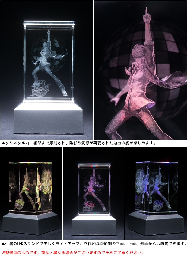 本作の主人公(鳴上悠)のイラストをクリスタルキューブ内に3D立体レーザー彫刻で再現。付属のLEDスタンドに設置することにより、光の加減や角度によってさまざまな見え方をしますので、煌びやかで飽きのこないインテリアアイテムとして楽しめます。