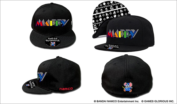 正面にマッピーのタイトルロゴ、後ろにマッピーの刺繍が施され、サイドには懐かしいNAMCOのロゴ刺繍入りのデザイン!