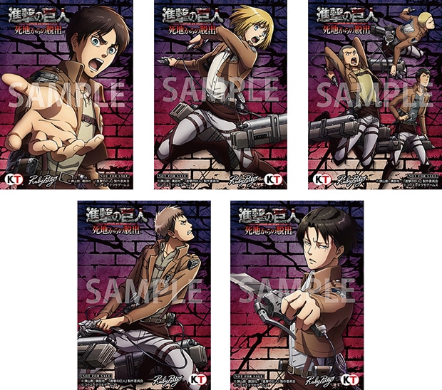 「エレン」・「アルミン」・「ジャン」・「コニー&ライナー&ベルトルト」・「リヴァイ」のイラストを使用したブロマイドセット。
